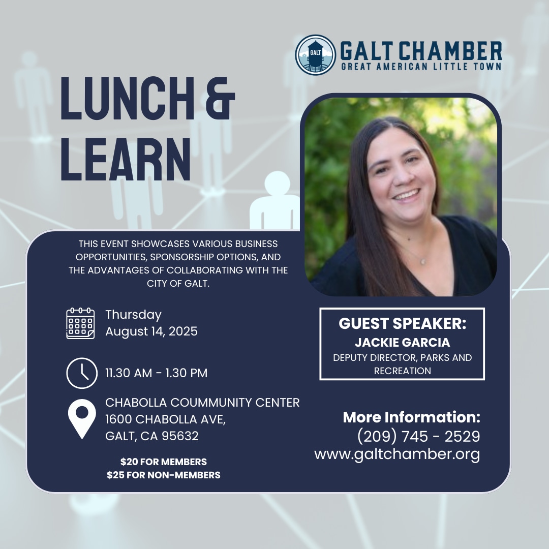 Join us for a Lunch and Learn with Jackie Garcia, where we'll explore sponsorship opportunities, collaborations, and various business ventures with the City of Galt. This is an event you won’t want to miss!