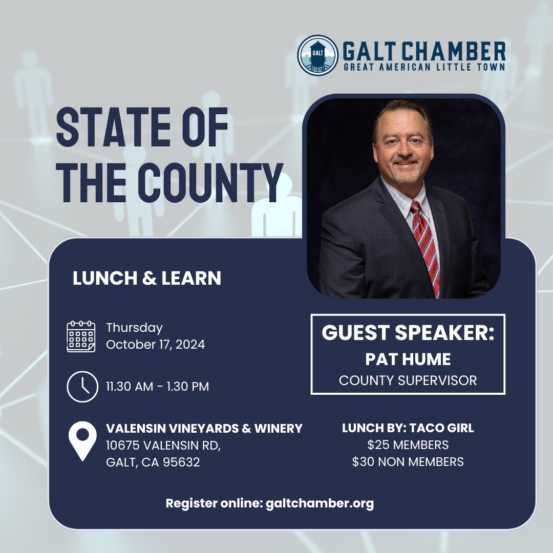 Join us for an insightful session with County Supervisor Pat Hume as he discusses the State of the County. This Lunch and Learn event is one you won't want to overlook. Connect with others, enjoy a delicious meal from Taco Girl, and discover the latest happenings in the county while taking in the beautiful views at Valensin Vineyard & Winery.