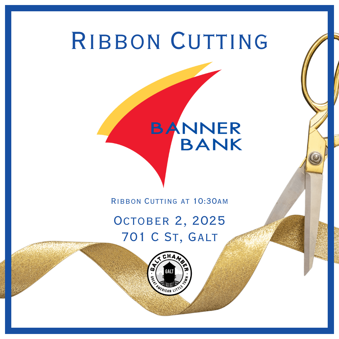 Come join us for a fun community celebration, network with local business leaders, and help welcome Banner Bank to the heart of Galt. This is a great opportunity to show your support, take photos, and connect with fellow Chamber members.